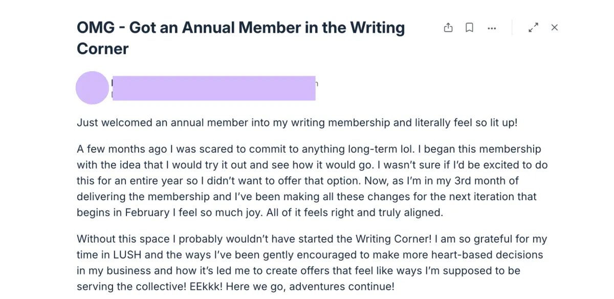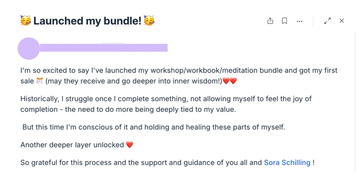 Inside LUSH, everything shifted. Instead of trying to force what wasn’t working, Sora guided me back to my intuition, my creativity, and the offers that actually lit me up. I created The Writing Corner, a membership that feels like the heart of my business — a space where my clients stay, return, and keep receiving transformation. For the first time, I felt grounded by one signature offer rather than trapped by it. It became the anchor I’d been searching for.