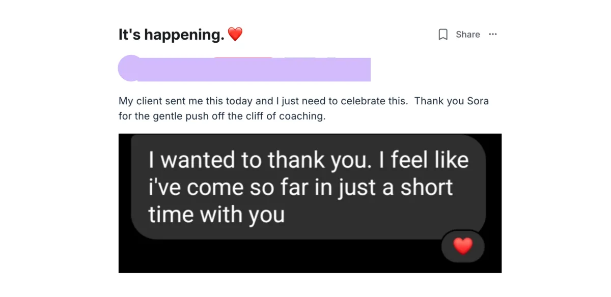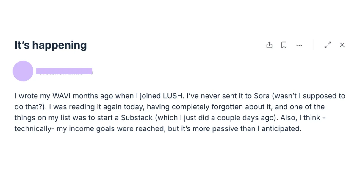 What makes LUSH different is the both/and: strategy and soul, structure and magic. Sora knows when to push, when to pause, and how to guide you into clarity without ever making you feel behind. The community has been equally powerful — a circle of peers who celebrate every milestone and remind me I’m not alone.