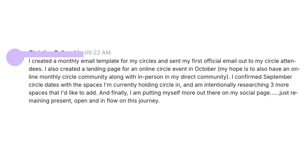 Since joining, I’ve run circles, created offers, and most importantly I’ve stopped being afraid. I show up online with confidence, share my work openly, and feel proud of who I am as a leader. The community has been invaluable: a circle of women walking the path together, where I don’t feel pressured or behind. Every coaching call, every spark of guidance, gives me momentum. I leave calls thinking, ‘I know what I’m doing. Let’s go.’