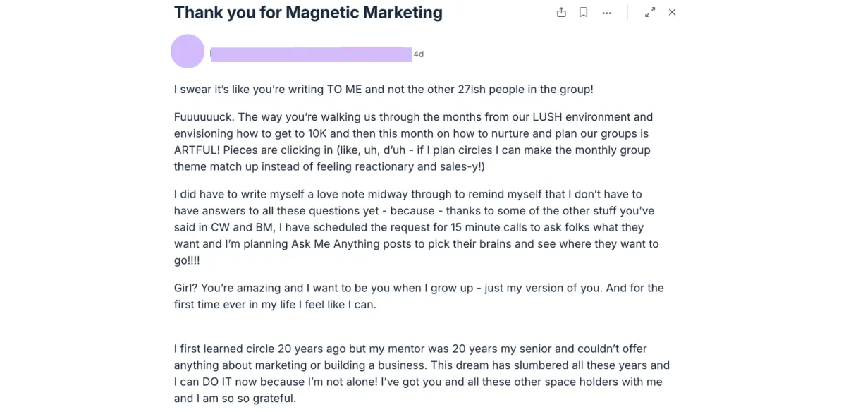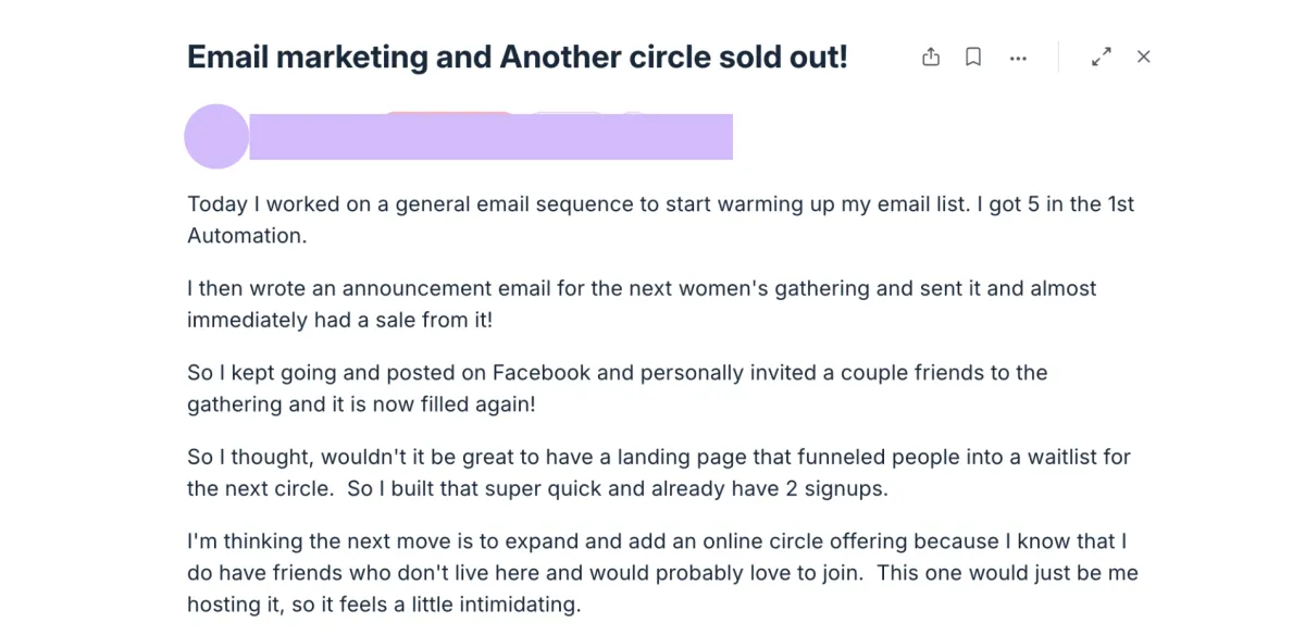Inside LUSH, everything changed. I ran five online circles including my best attended ever. I created my first real systems: batching content, building templates, even learning how to work with a VA. For the first time, scaling felt possible. I’ve sent 1–3 emails a week since December, something I’ve never done consistently before. I built my freebie, practiced discovery calls, and even practiced naming my prices in community until it felt normal. This mastermind gave me a safe place to be awkward, to be celebrated, and to grow into the leader I know I can be.